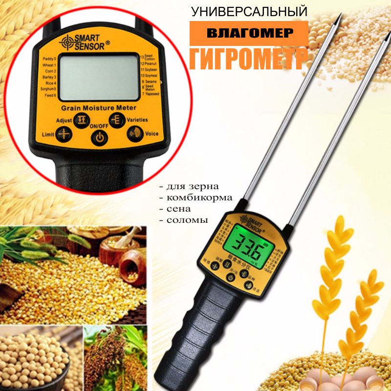 Предназначен для замера влажности: пшеницы, кукурузы, гороха, риса, сорго, рапса, семян дыни, семян арбуза, соя, кунжута, сена, соломы, комбикорма